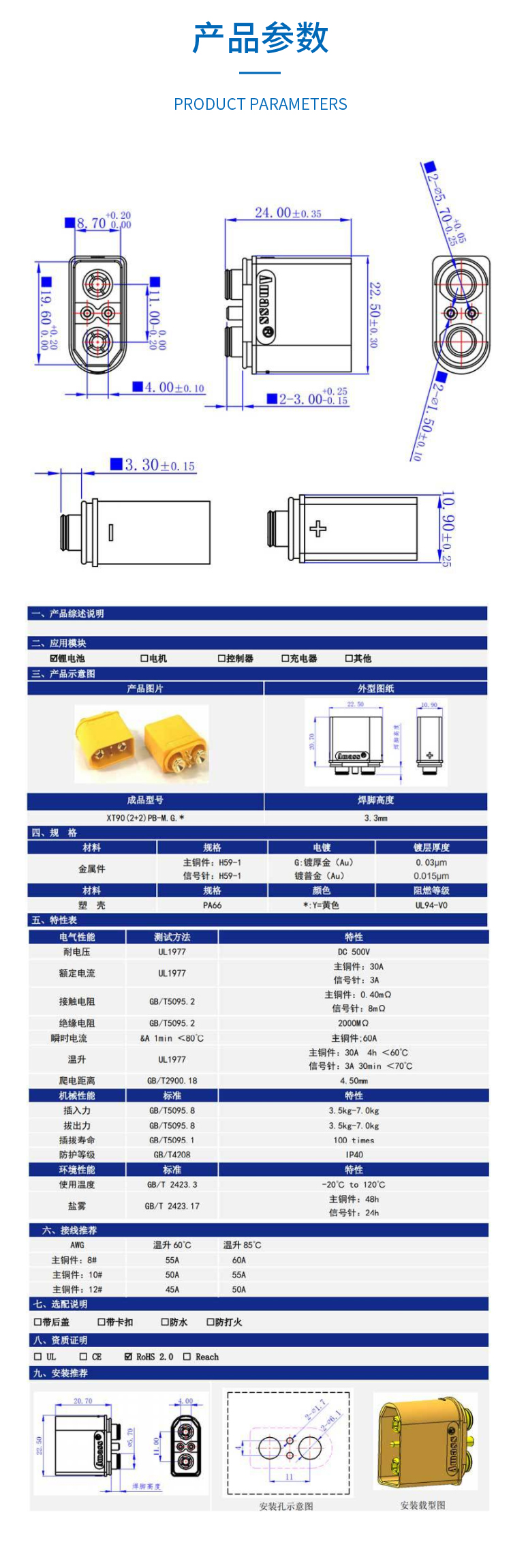 艾邁斯XT30PW-M36 PCB板用2芯臥式連接器銅鍍金阻燃插頭AMASS配件
