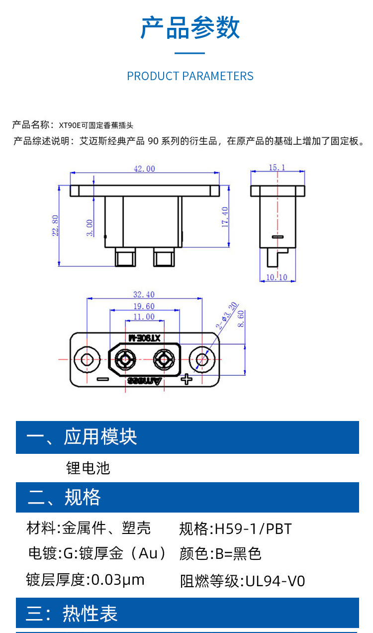 艾邁斯新品XT90E-M公頭帶固定孔黑色鍍金航模連接器AMASS模型配件