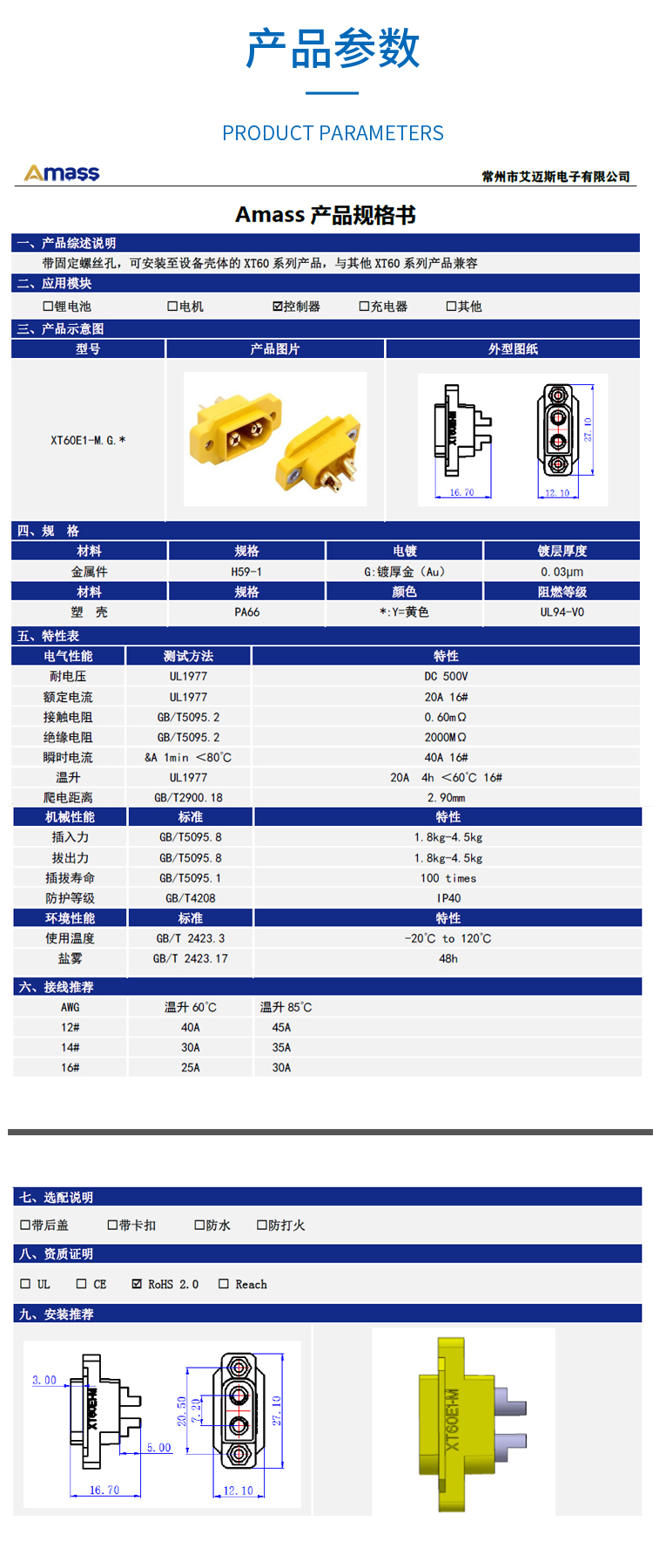 艾邁斯新品MR60PW-M三芯臥式模型插頭T插接口連接器Amass正品配件