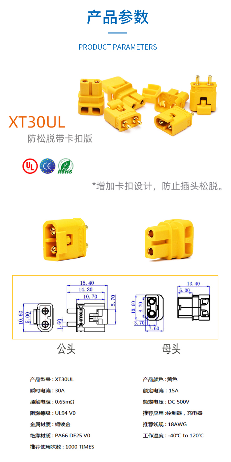 艾邁斯專利 XT30ULW/XT30ULB防脫插頭 2mm鍍金連接器