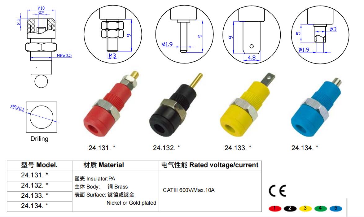 24.131 鍍金2mm面板插孔2mm Socket with M3 SCREW CONNECTION熱賣接線柱