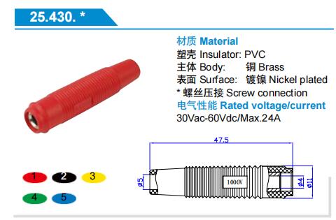 25.430 4毫米香蕉插頭母頭 鍍鎳 焊接型 PVC30Vac60Vdc/Max.24A