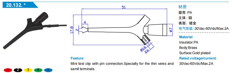 20.132 艾邁斯專業(yè)帶線迷你測試鉤耐2A鍍金飛機測試爪測試夾AMASS正品