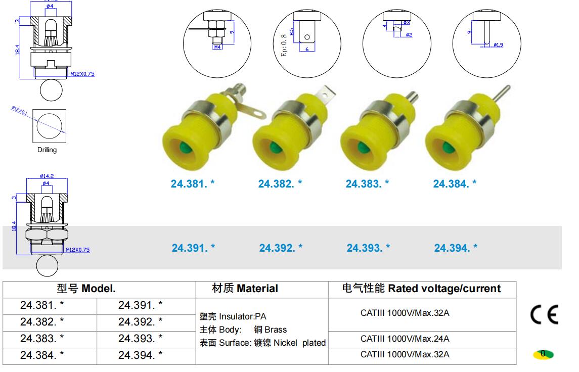 艾邁斯24.381 4mm安全型公頭M12面板插座尼龍耐高壓帶焊接片AMASS