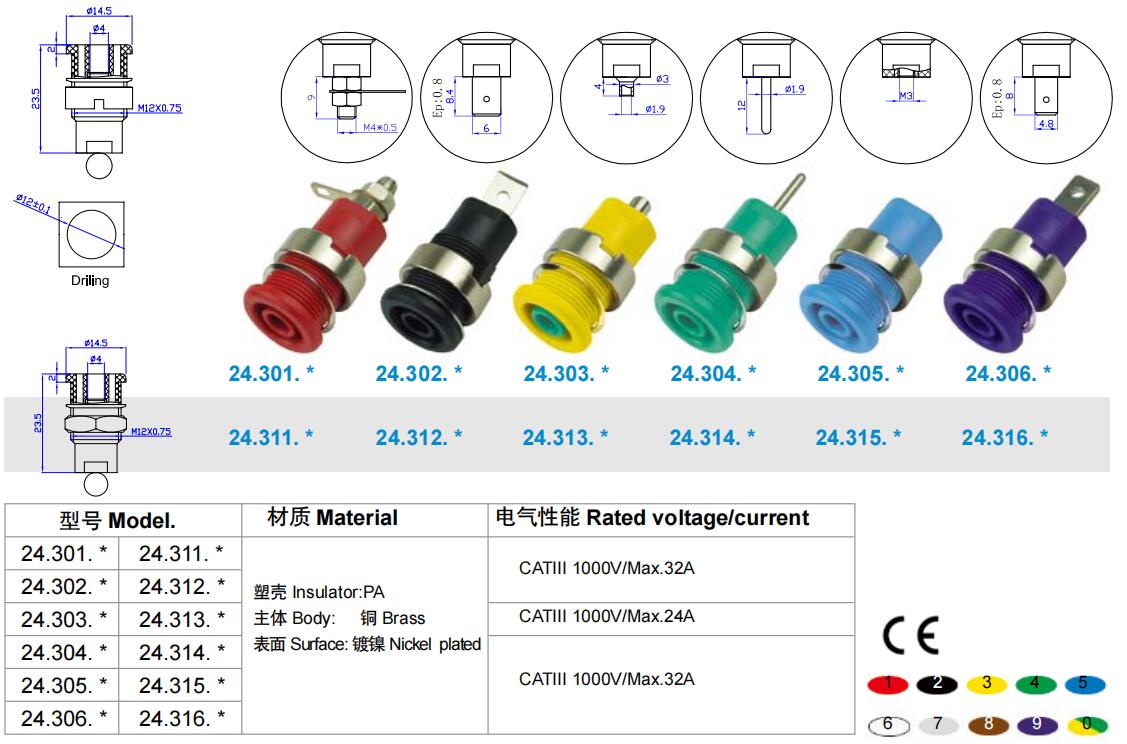 艾邁斯24.306 4mm免焊接M12安全面板插座4.8*0.8插片銅鍍鎳AMASS