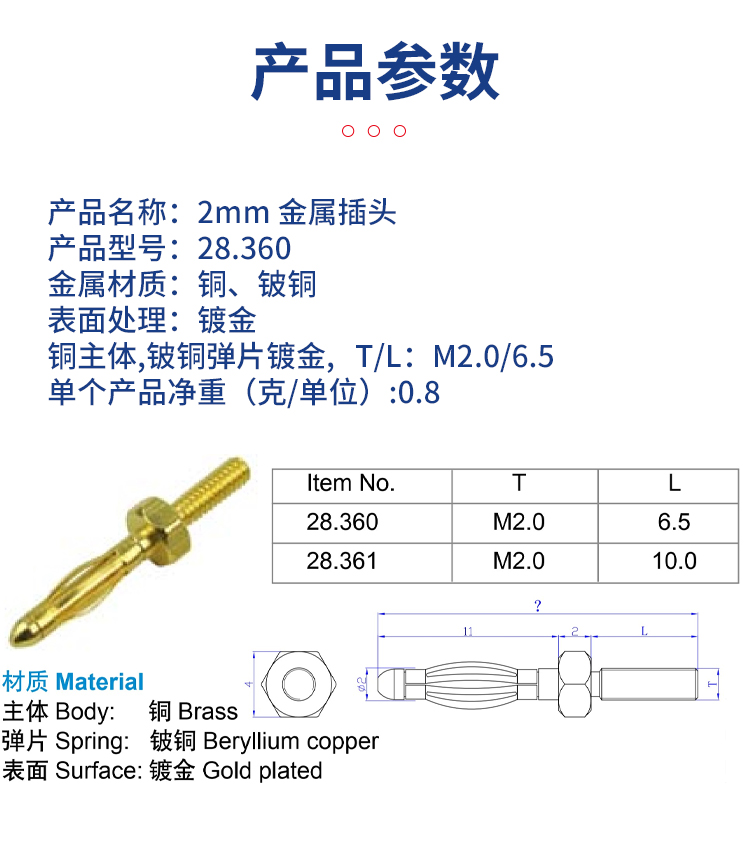 28.360 艾邁斯2mm金屬插頭全銅鍍24k真金尾部螺紋M2*6.5熱賣連接器AMASS