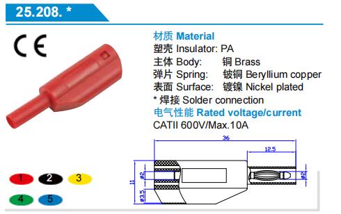 25.208 2mm安全型可疊加純銅香蕉插頭 純銅鍍金高壓帶護(hù)套PA塑 殼耐10A