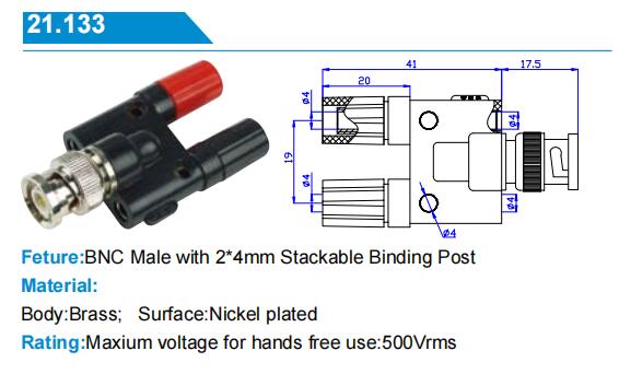 21.133 艾邁斯轉(zhuǎn)換插頭,BNC公轉(zhuǎn)2*4mm接線柱面板插座銅鍍鎳AMASS正品配件