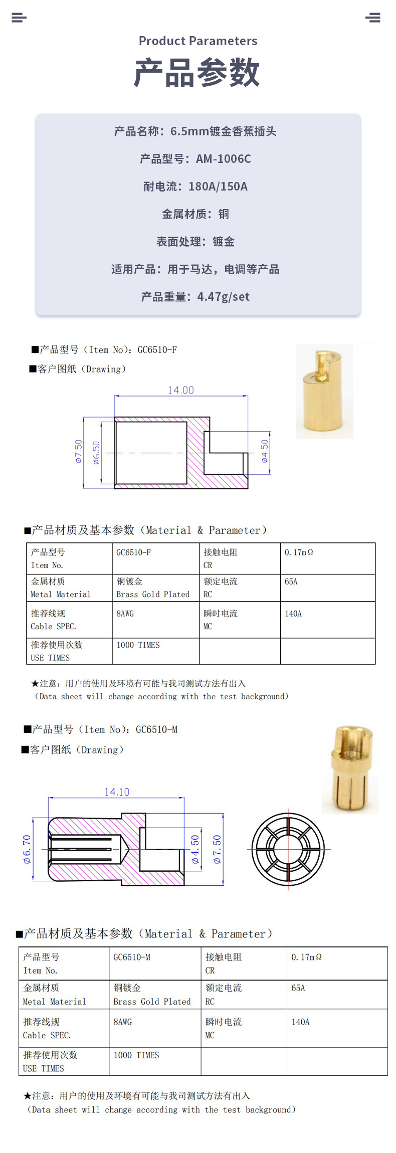 艾邁斯6.5mm香蕉插頭電機電調(diào)純銅航模連接器Amass熱賣配件GC6510
